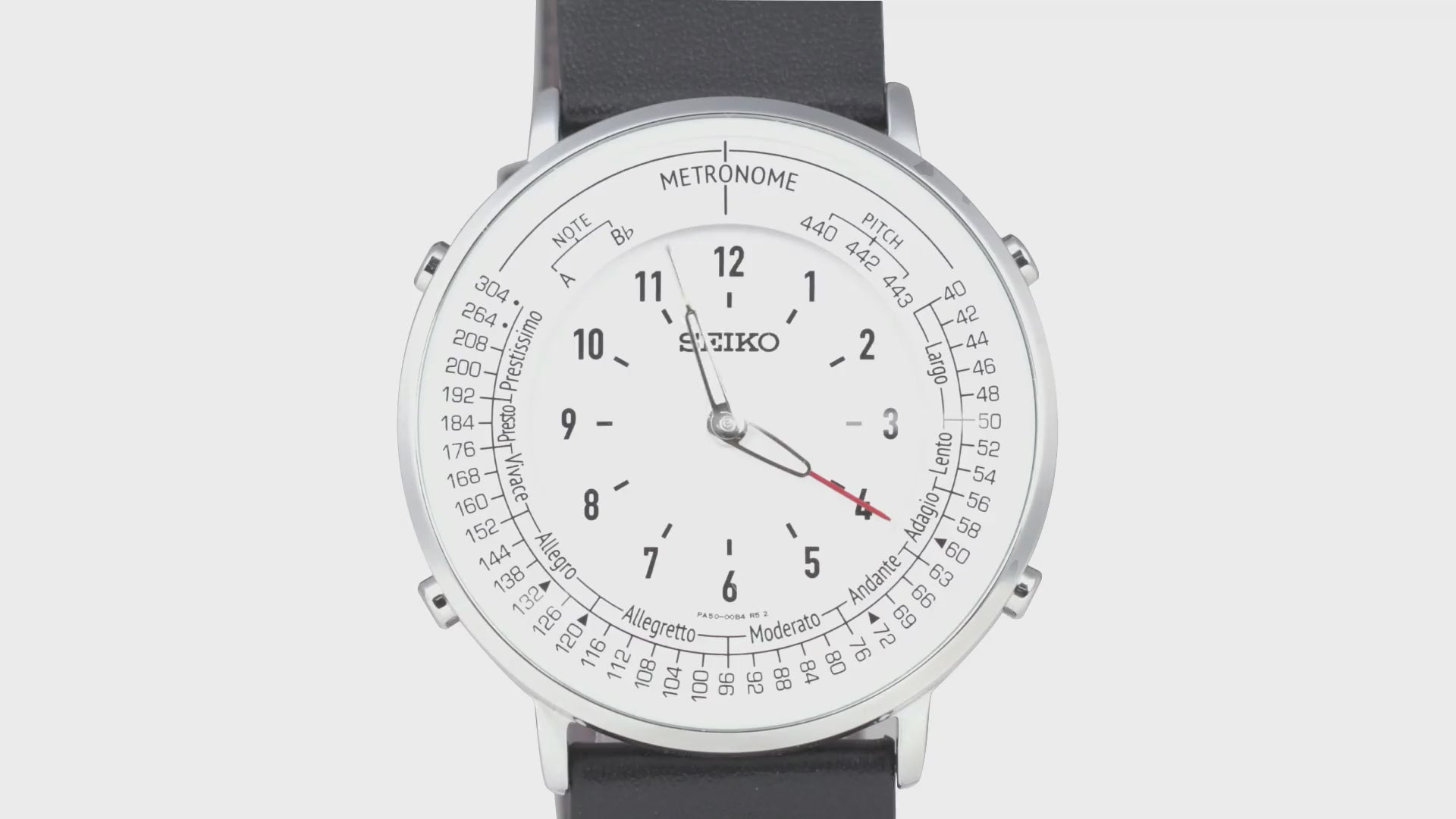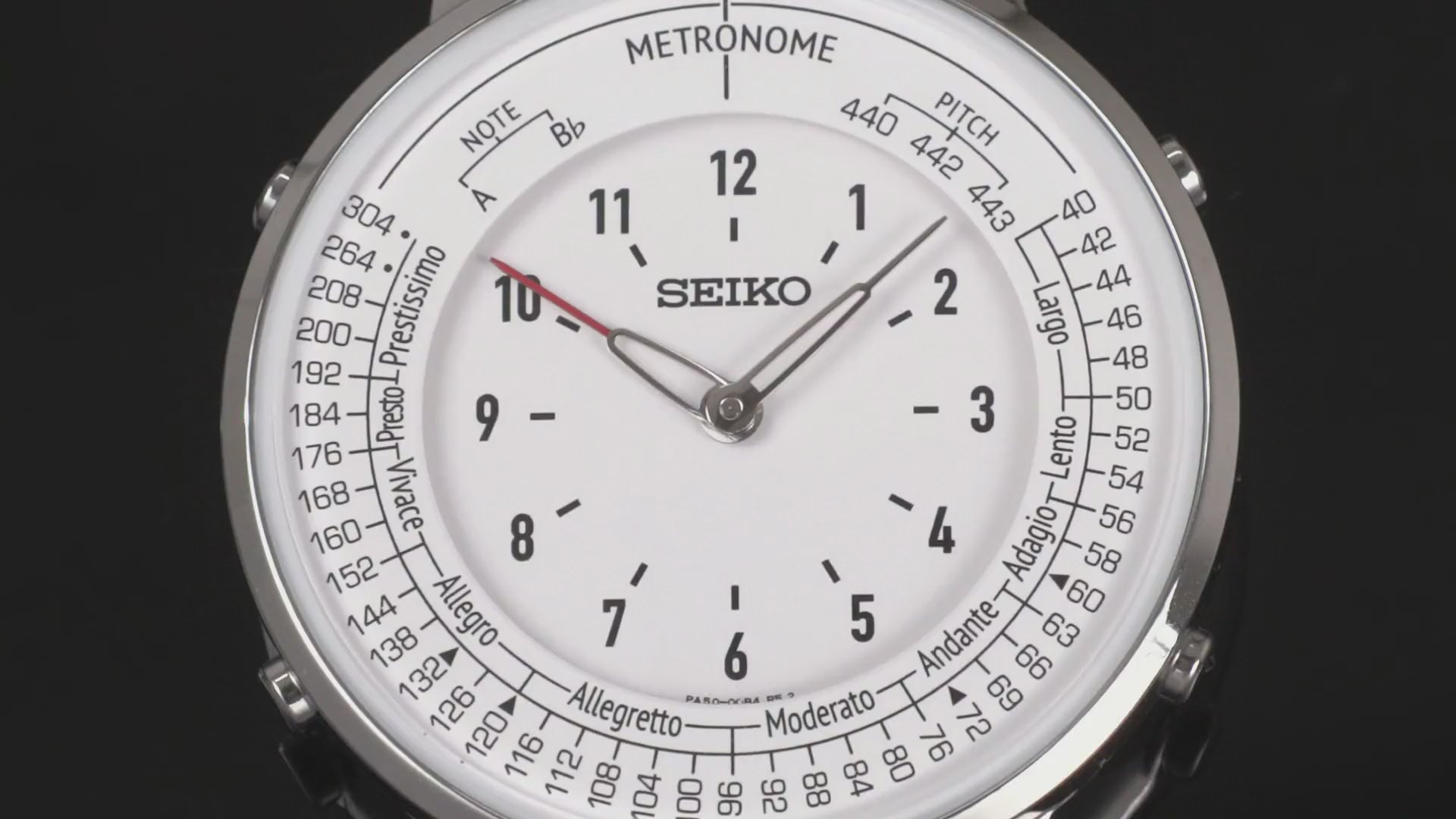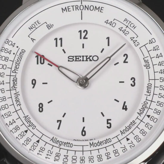 文字板には内側に時刻表示、外側にメトロノームのテンポや基準音の目盛りを配置。